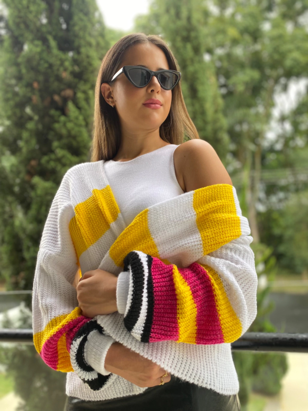 Casaco branco com listras amarela, preta e rosa. Um casaco fashionista para apostar nesse Outono- Inverno. Casaco macio e confortável com mangas mais amplas. Apesar de um casaco colorido, ele possui cores de fácil combinação, peça versátil.