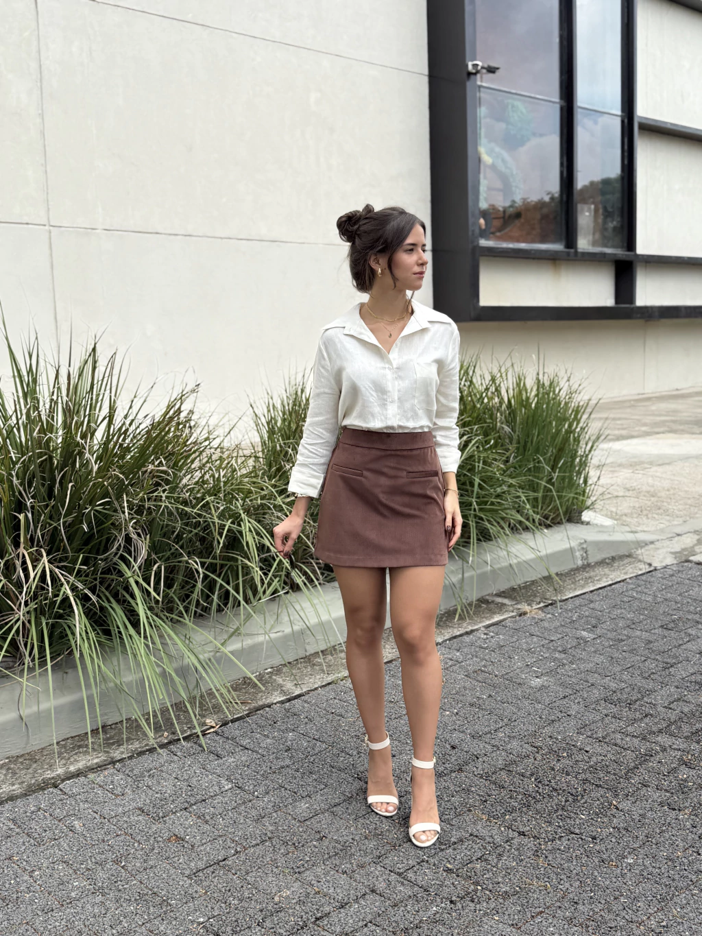 A saia suede marrom é a peça que você precisa para montar seus looks de inverno! Possui shorts em tecido leve que garante mais conforto ao se sentar. Com um design elegante e moderno, esta saia apresenta detalhes de bolsos frontais que acrescentam um toque prático e charmoso. O fechamento por zíper invisível na parte de trás garante um caimento perfeito e discreto.